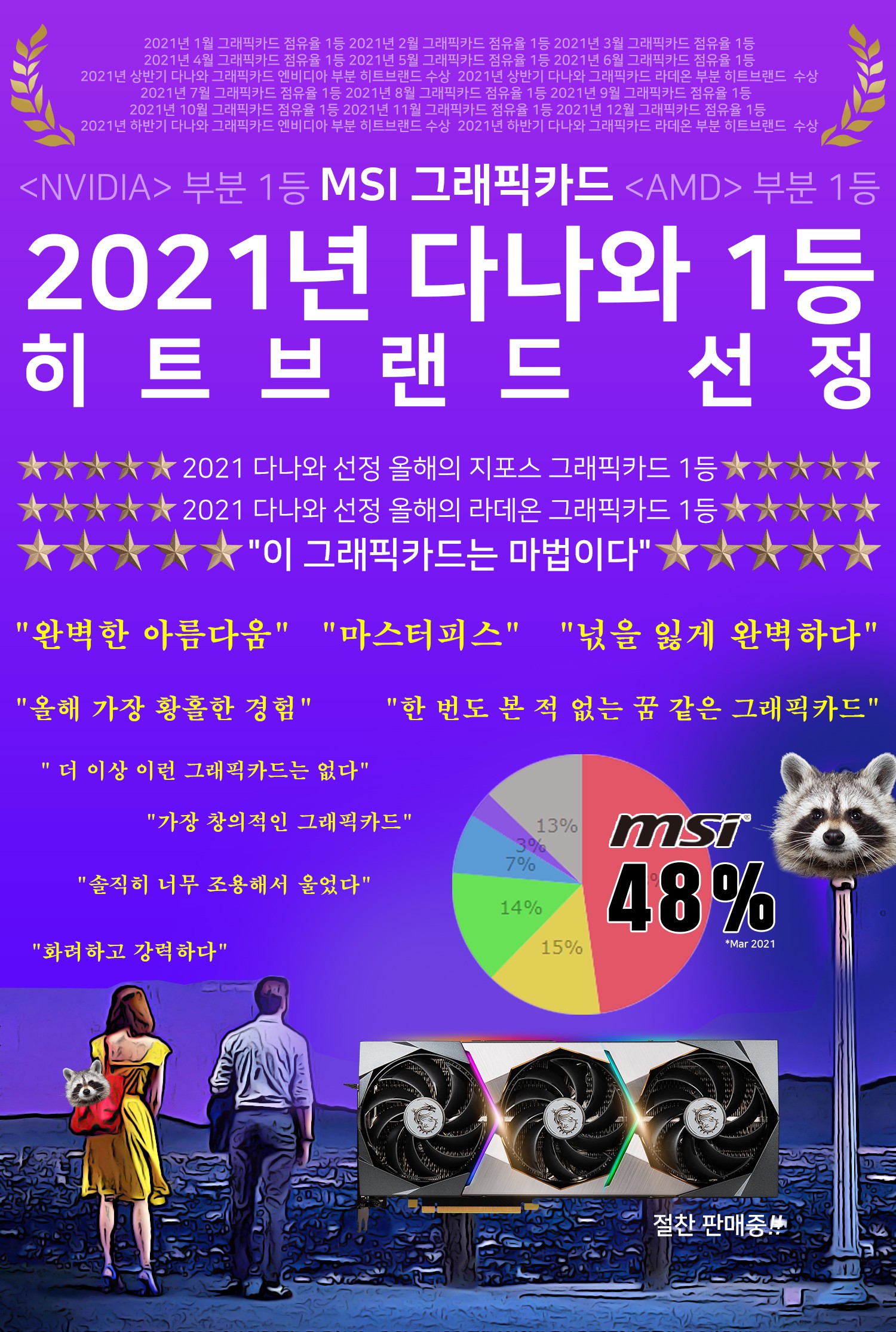 . 이벤트 기간 2022년 1월 5(수) ~ 1월 18일(화) 2. 당첨자 발표 2021년 1월 20일(목) 이후 당첨자 개별 안내 3. 참여 대상 MSI 그래픽카드를 사랑하시는 모든 분들 4. 이벤트 경품 MSI 지포스 RTX 3060 게이밍X 트윈프로져8 * 1명 http://prod.danawa.com/info/?pcode=13470908 MSI 럭키박스 * 10명 너구리 라면 기프티콘 * 200명 5. 신청서 제출 링크 http://naver.me/Gfo0gdQL 6. 참여 방법 1) 신청서 제출 링크에 접속합니다. 2) 퀴즈 정답을 입력합니다. 3) 이벤트에 관한 내용을 블로그 / 카페 / 소셜네트워크 / 기타 커뮤니티 등에 업로드 합니다. (단, 해당 카페, 커뮤니티 등..